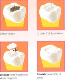 Gli intarsi sono inserti riempitivi in ceramica che sostituiscono le classiche otturazioni in composito. Vengono creati su misura dall’odontotecnico il quale si serve di una impronta di precisione fatta dal dentista dopo aver rimosso la vecchia otturazione o la parte di dente ammalata, per poi essere fissati al dente tramite una moderna tecnologia adesiva che garantisce altissime prestazioni. Questo permette di ottenere una cementazione molto precisa, eliminando il rischio di infiltrazioni tra dente e intarsio, conferendogli una garanzia di lunga durata. Inoltre gli intarsi sono esteticamente armonici, in quanto si confondono con il dente garantendo un aspetto estremamente naturale.